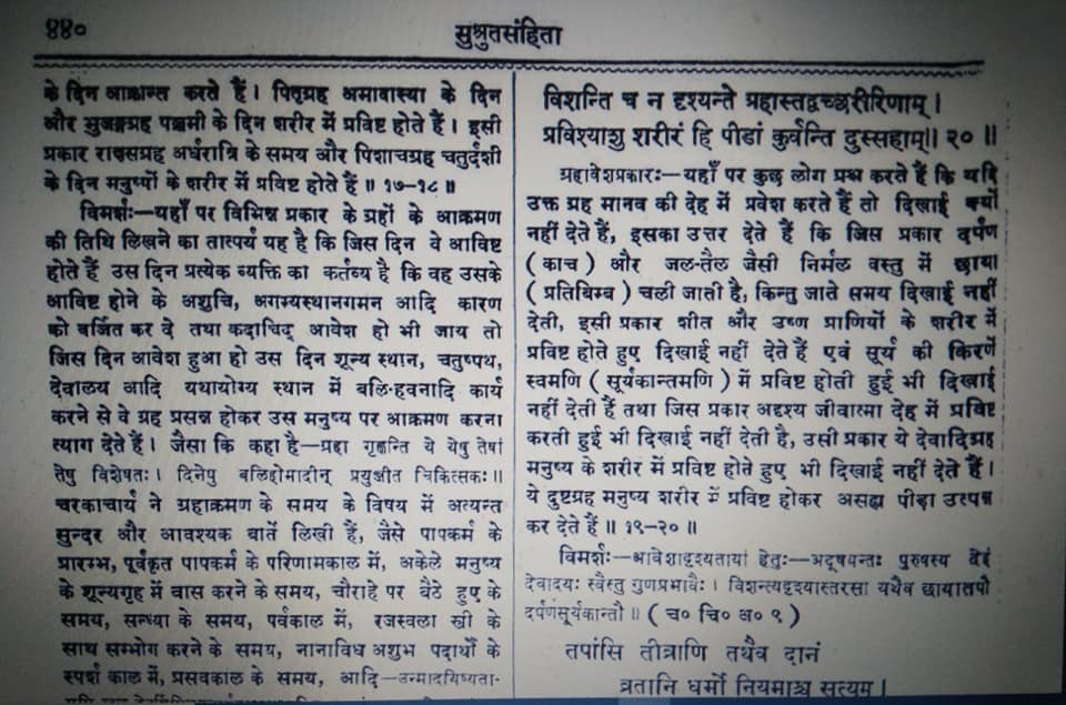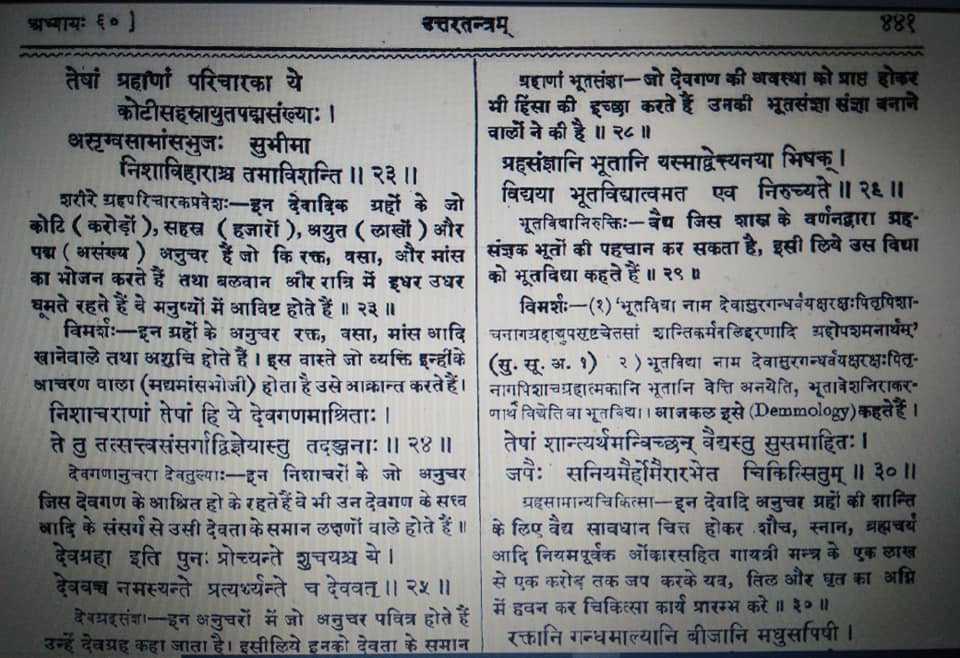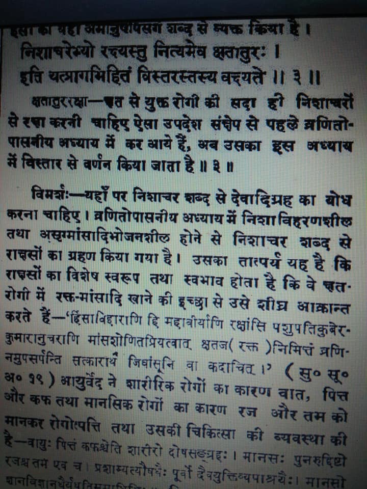 आयुर्वेद की मूल सुश्रुत-चरकादि संहिताओं में आयुर्वेदविधा से असाध्य और अशक्य रोगियों के लिए ज्योतिष, कर्मकाण्ड आदि से सफल चिकित्सा के असंख्य विधान हैं; जिनके अधिकारी सब नहीं हो सकते। ज्योतिष, कर्मकाण्ड और तन्त्र- ये आयुर्वेद के सर्वप्रमुख भाग हैं। मैं इन पङ्क्तियों के साथ मन्त्रभाग वेद, सुश्रुत संहिता और चरक संहिता के कुछ छायाचित्र प्रकाशित कर रहा हूँ; अवश्य देखें।