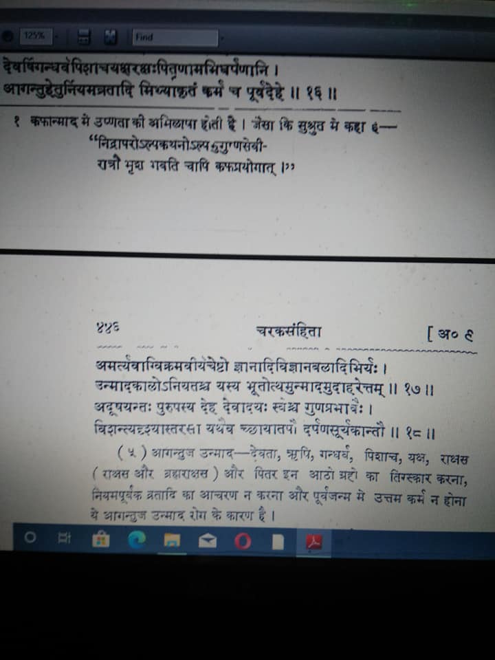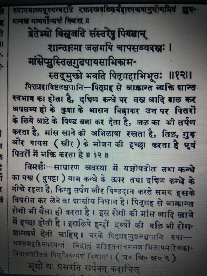 चरकसंहिताचिकित्सितस्थान में लिखा है- “अन्नाभिलाषमरोचकाविपाकपरीतं पितृभिरुन्मत्तं विद्यात्” जिसे अन्न खाने की बहुत अभिलाषा हो, परन्तु उसे अरुचि एवं पाचनक्रिया की समस्या हो तो वह पितृपीड़ा या पितृदोष से उन्मत्त है; चिकित्सक ऐसे रोगी को पितृश्राद्ध के लिये प्रेरित करे। सुश्रुतसंहिता के अनुसार- “प्रेतेभ्यो विसृजति संस्तरेषु पिण्डान् तद्भक्तो भवति पितृग्रहाभिभूत:” कुशल चिकित्सक पितृग्रहाभिभूत उदररोगी के लिए अन्यान्य उपचारों के अतिरिक्त आस्तृत कुशाओं पर प्रेत-पितरों के निमित्त पिण्डदान करने की प्रेरणा दे। ऐसे सैकड़ों स्थलों में आयुर्वेद ने पितृग्रहाभिभूत, देवग्रहाभिभूत और असुरग्रहाभिभूत आदि की चिकित्सा के लिए कर्मकाण्ड, ज्योतिष और तन्त्र का बहुत उपयोग किया है। वस्तुत: चिकित्सकों को स्वयं इन विषयों का भी विशेषज्ञ होना चाहिए अथवा इनके विशेषज्ञों से घनिष्ठ सम्बन्ध रखना चाहिए।